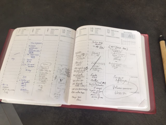 Mon carnet actuel que pour moi : au crayon de papier, la programmation, au stylo, le réalisé. Sous Excel, c'est plus propre :) |